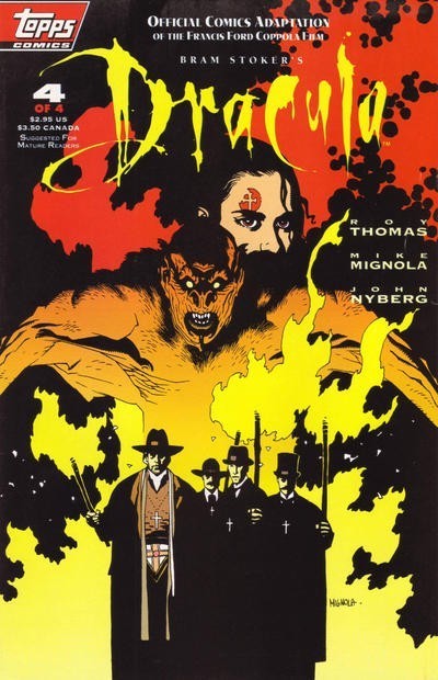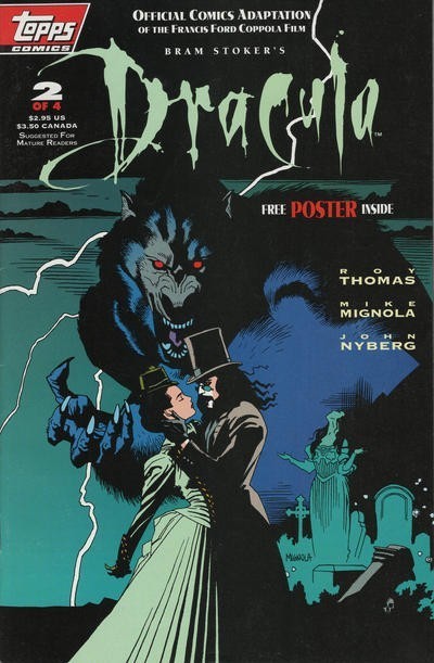 *Written by Roy Thomas. Art by Mike Mignola John Nyberg. Cover by Mike Mignola. The very first comic from Topps! It's the official adaptation of the Francis Ford Coppola film, starring Gary Oldman, Winona Ryder, Anthony Hopkins and Keanu Reeves! Faithfully adapted from James V. Hart's screenplay by Thomas, Mignola and Nyberg. Issue #1 arrives almost a month before the film's November premiere, and chronicles the origin of Dracula, depicting his transformation from Vlad the Impaler into the accursed vampire! Plus: Behind-the-scenes photos and interviews!