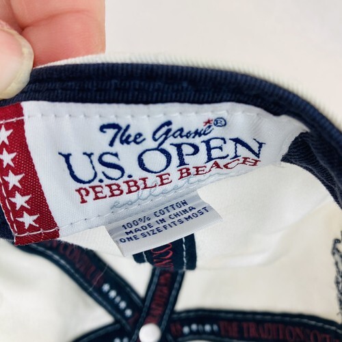 Great 2010 US Open Pebble Beach adjustable 100% cotton baseball hat featuring red white and blue colors and an American flag on front. Made by The Game. Back hit says ?The Tradition Continues ?.