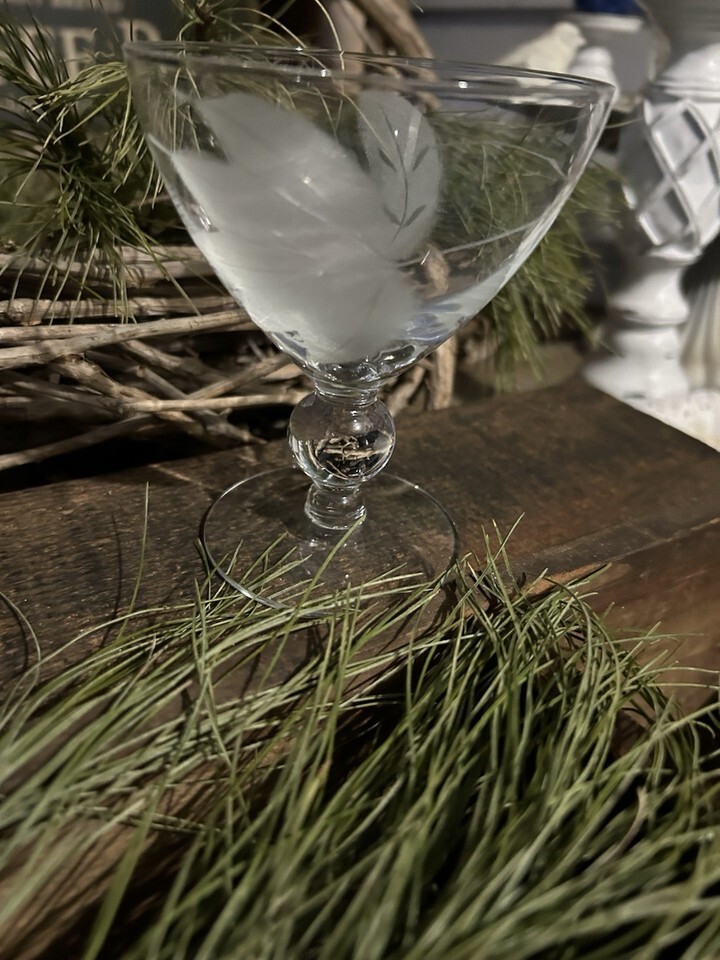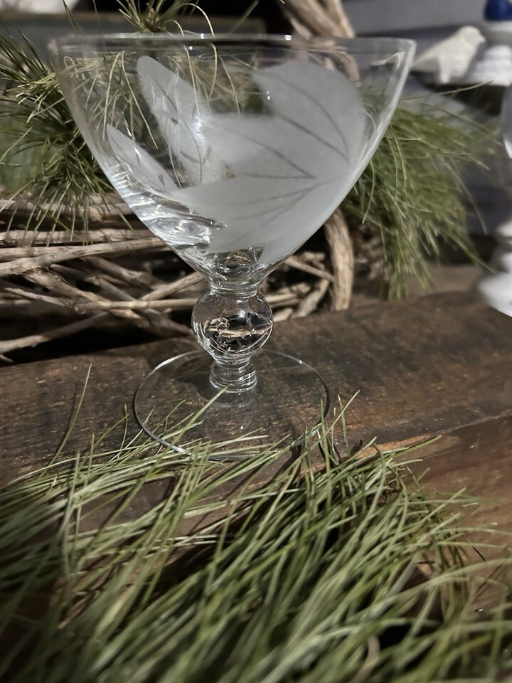 Features: Etched frosted leaves with swirling lines, clear crystal bowl, and a ball-shaped stem