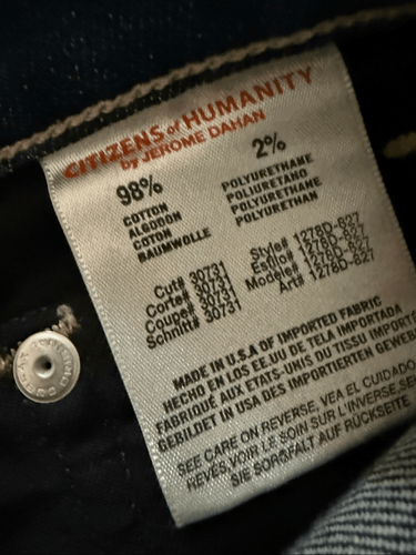 Citizens of humanity women?s Ava low rise, straight leg jeans. Button and zip closure. 98% cotton and 2% polyurethane. Brand tab at the hip and brand patch at the back waistband. Laying flat measures 14 inches straight across the waist with an 8 inch rise and 27 inch inseam. My daughter blew through this size so these were barely worn if ever worn it all