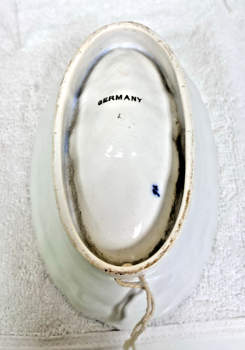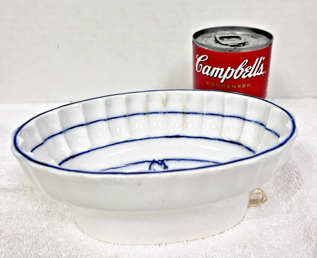 Antique Blue White Germany Grapes Ironstone Jelly Pudding Mold measures approx. 7" long, 4 5/8" wide and 2 7/8" tall/deep. Great condition, no signs used, no cracks or damage, bottom rim edge shows age wear, inside scalloped panel pattern has a couple of edges show age spotting, blue white grape pattern in very good condition. See pictures.