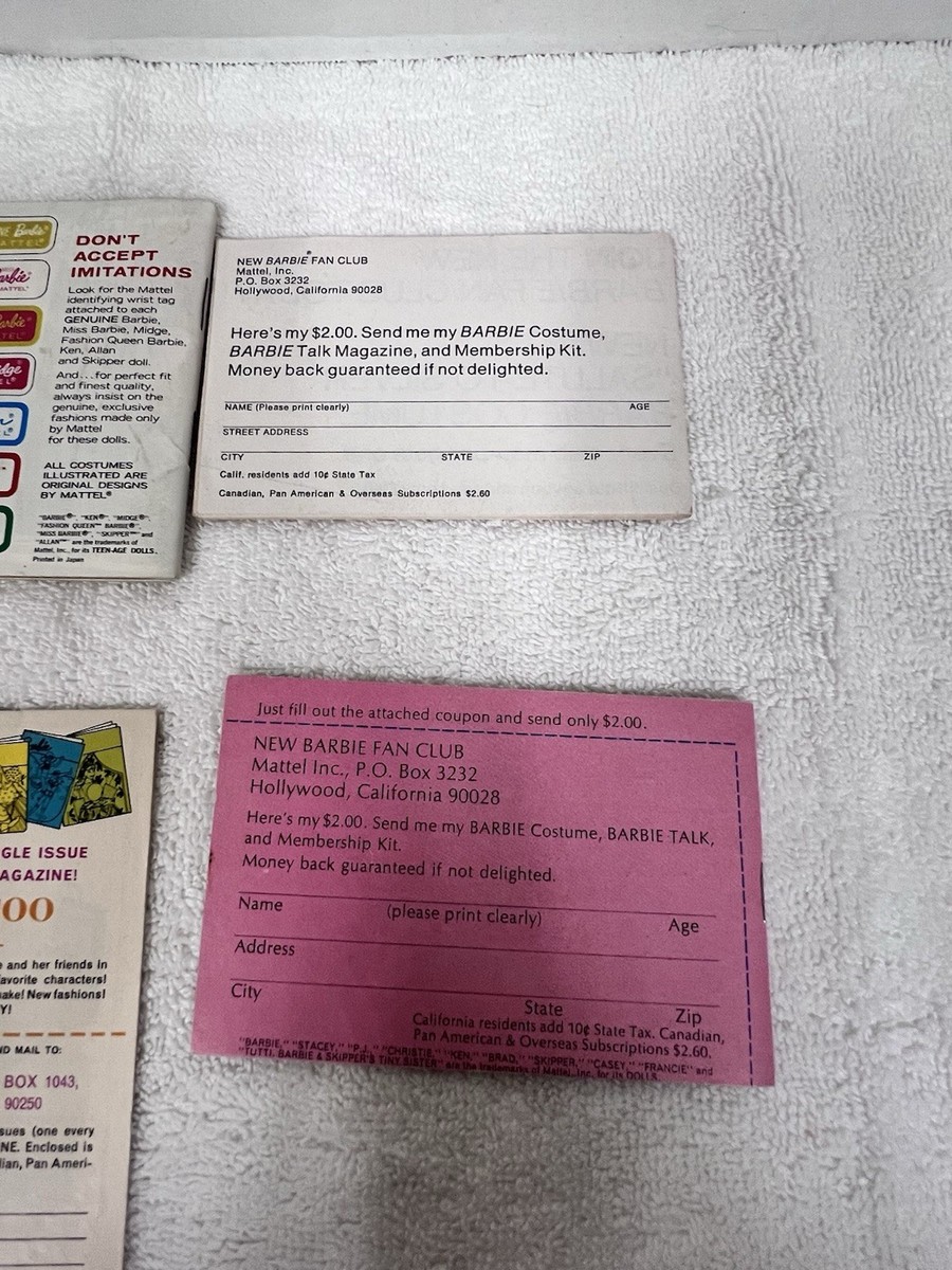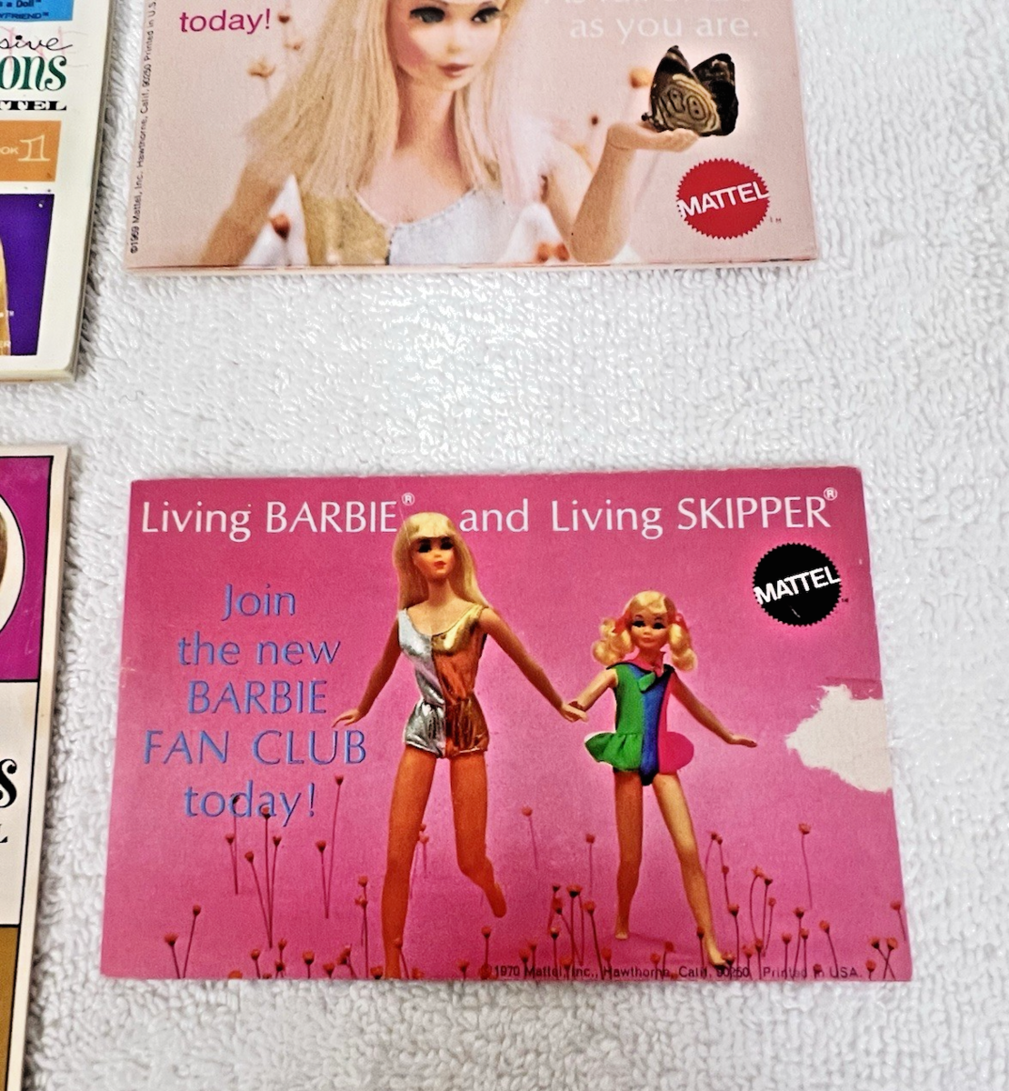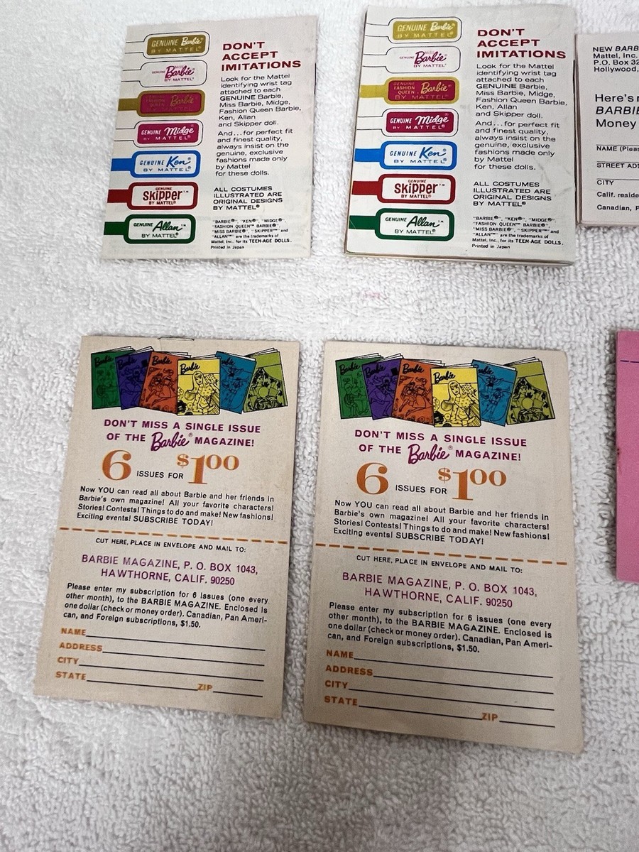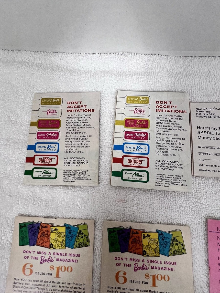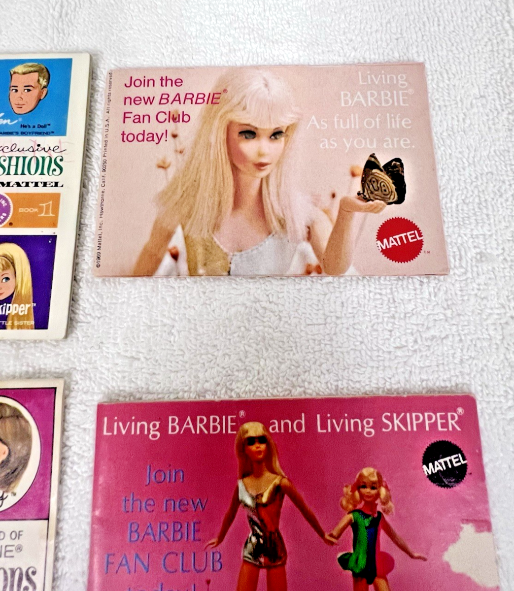 6 Vintage Barbie Fashion Booklets Skipper Casey Allan Skooter Ricky Tutti Todd Midge Ken Francie. Small lot vintage 6 Barbie accessory fashion booklets includes a Junior edition Skipper booklet. Most items are in very good condition, no tears minor if any wrinkling, one of the 2 World of Barbie Fashions by Mattel Book 2 some tape. Sizes vary from smallest, Skipper and Book 1 of Exclusive Fashions - this booklet has an owners name in red, measures approx 2 7/8" by 3 7/8"" to the largest 4 of the booklets, 2 World of Barbie Fashions Book 2; Living Barbie and Living Skipper; Living Barbie As full of Life a you are which measure approx. 3" by 4 1/2". All booklets by Mattel. See pictures.