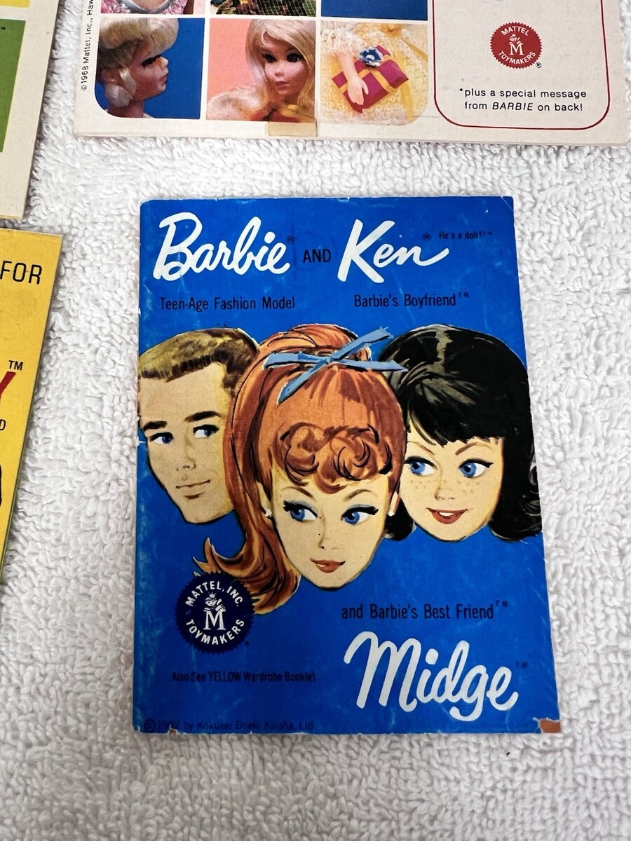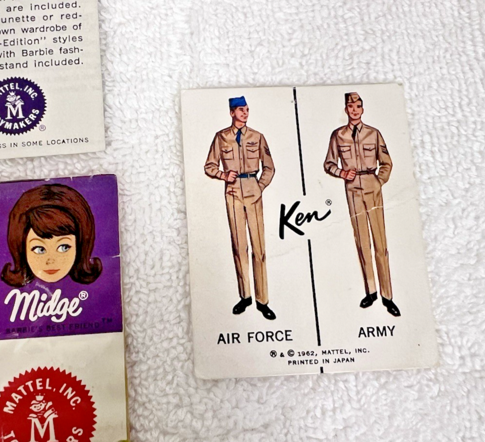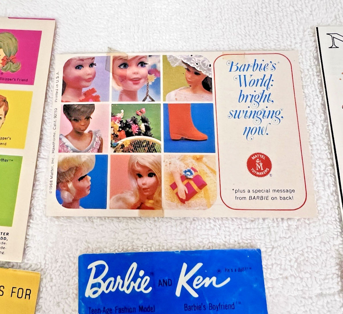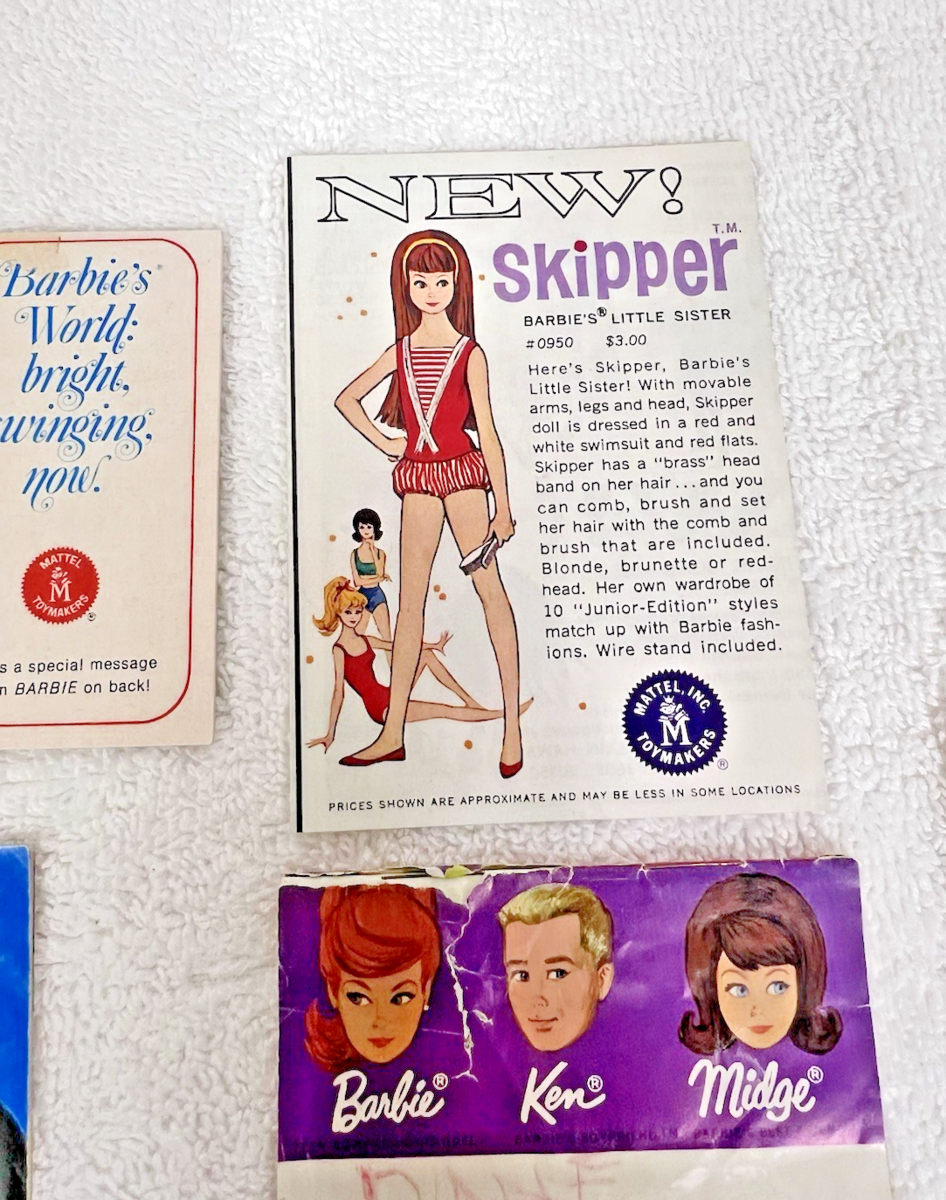 6 Vintage Barbie Fashion Booklets Skipper Skooter Ricky Tutti Todd Midge Ken and 1962 Ken Card. Small lot vintage 6 Barbie accessory fashion booklets, one Skipper price insert, and one 1962 Ken Card Air Force/Army. Most items are in very good condition, a couple of the booklets have wrinkling, one has a small tear. Sizes vary from smallest, the Ken card 2" by 2 1/2" to the largest Skipper Skooter Ricky Tutti Todd Fashions and Play accessories by Mattel booklet which measures approx 3" by 4 1/2". See pictures.