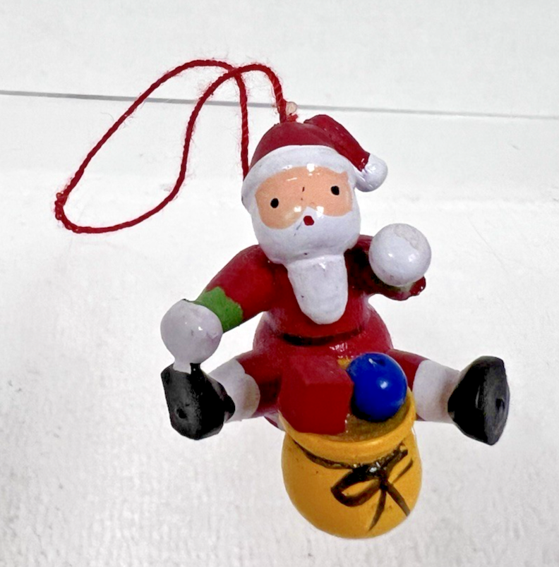 Miniature Painted Wooden Santa Claus Toy Presents Bag Ornament 1 1/8" Tall. Very good condition approx. 1 1/8" tall painted wood Santa Claus ornament, no damage or wear to paint, might need some cleaning. See pictures.