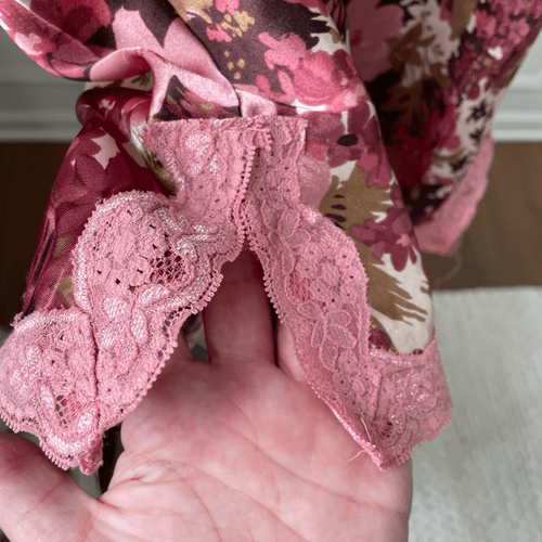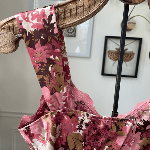 Vintage Y2K, Kelly Renee sleeveless wide strap, satin floral Cami or tank top with pink lace trim. The floral print ranges from pink to mauve to burgundy with shades in between. On a light beige background with bronze brown foliage. Notched hip for easy movement. 100% polyester. Laying flat measures 26 inches shoulder to hem and 17 inches armpit to armpit with gentle folds to accommodate cup size.