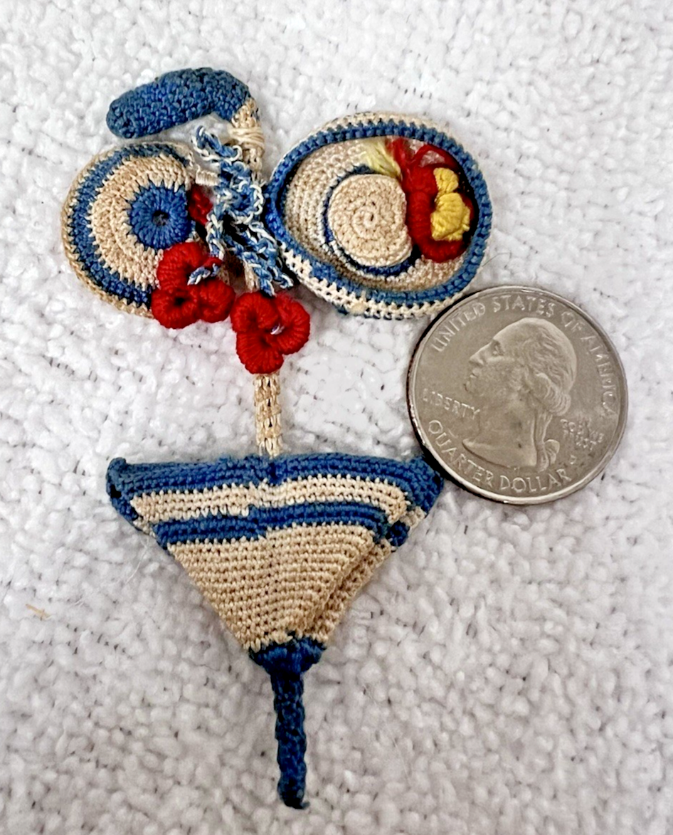 Vintage Miniature Dollhouse Toy Blue White Crochet Wire Parasol Umbrella Hat Purse. Fine detail adorable miniature blue white crochet knit umbrella parasol with hat and purse with small red dangles. Umbrella dollhouse toy accessory measures approx. 3 1/8" long, no damage, some dirtiness from age. See pictures. (this is 1 piece it is not to be worn just a display)