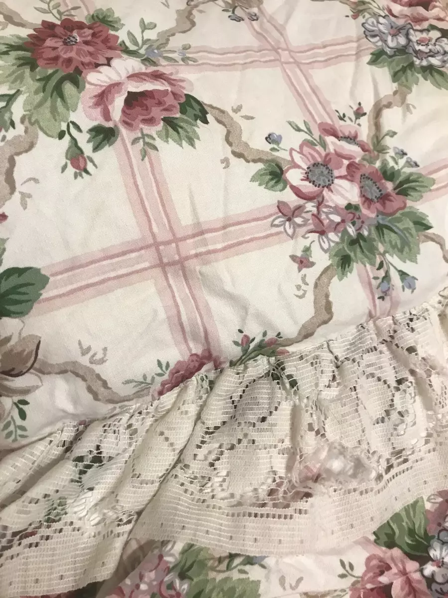 Accented with ruffle and lace trim edge on three sides for a cottage style.