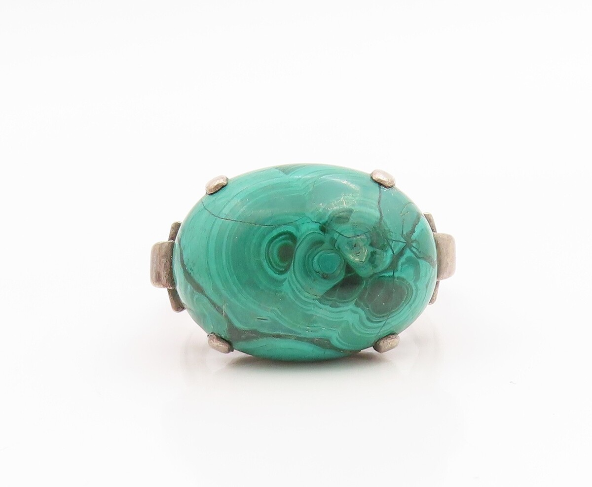 925 Sterling Silver Vintage Ring Modernist Cabochon Malachite Band Sz 8 RG35847