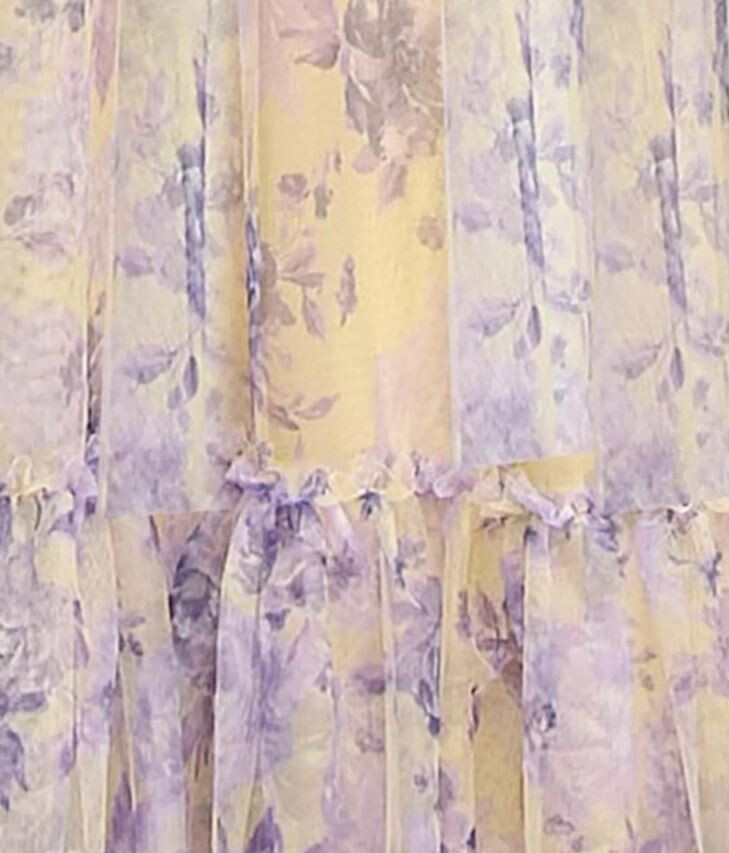 This gown blends a dreamy color palette with a soft, romantic silhouette, making it a standout choice for formal events, school dances, and special occasions. The yellow and purple printed tulle creates a whimsical, eye?catching look, while the layered construction adds movement and dimension.