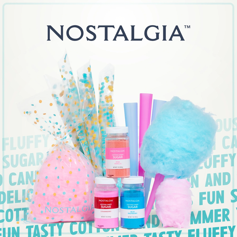 This is a fun, convenient, and easy way to make sweet, sugary cotton candy from the comfort of home with the Nostalgia FSCC8 Cotton Candy Party Kit. Kit makes up to 42 fluffy and delicious cotton candy cones. The kit includes 7 ounce jar of Pink Vanilla flossing sugar, 7 ounce jar of Blue Raspberry flossing sugar, 7 ounce jar of Strawberry flossing sugar, and also includes 4-reusable color cones, along with 10-clear plastic bags with twist ties. Designed to be used with all Nostalgia cotton candy makers.