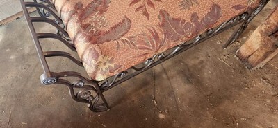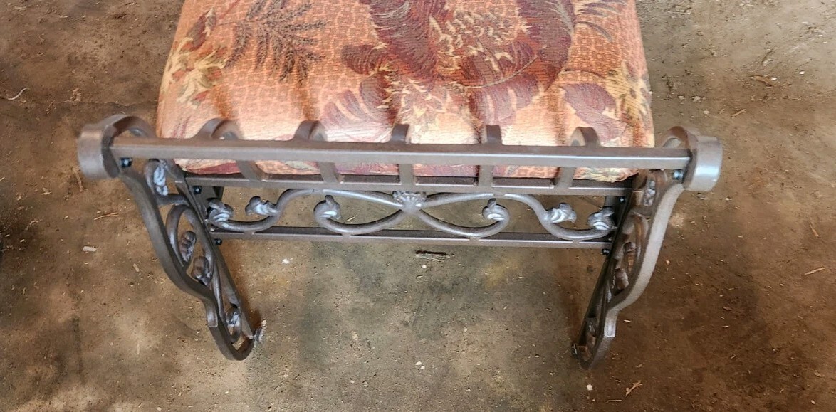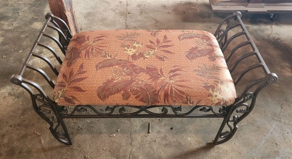 Good condition bench. Metal sides. Cushion is a stiff padding. Floral design. Measures 4inches total length. 22 inches high at the ends. 18 inches high at the padding. 21 inches deep. Can be picked up locally to save on shipping.