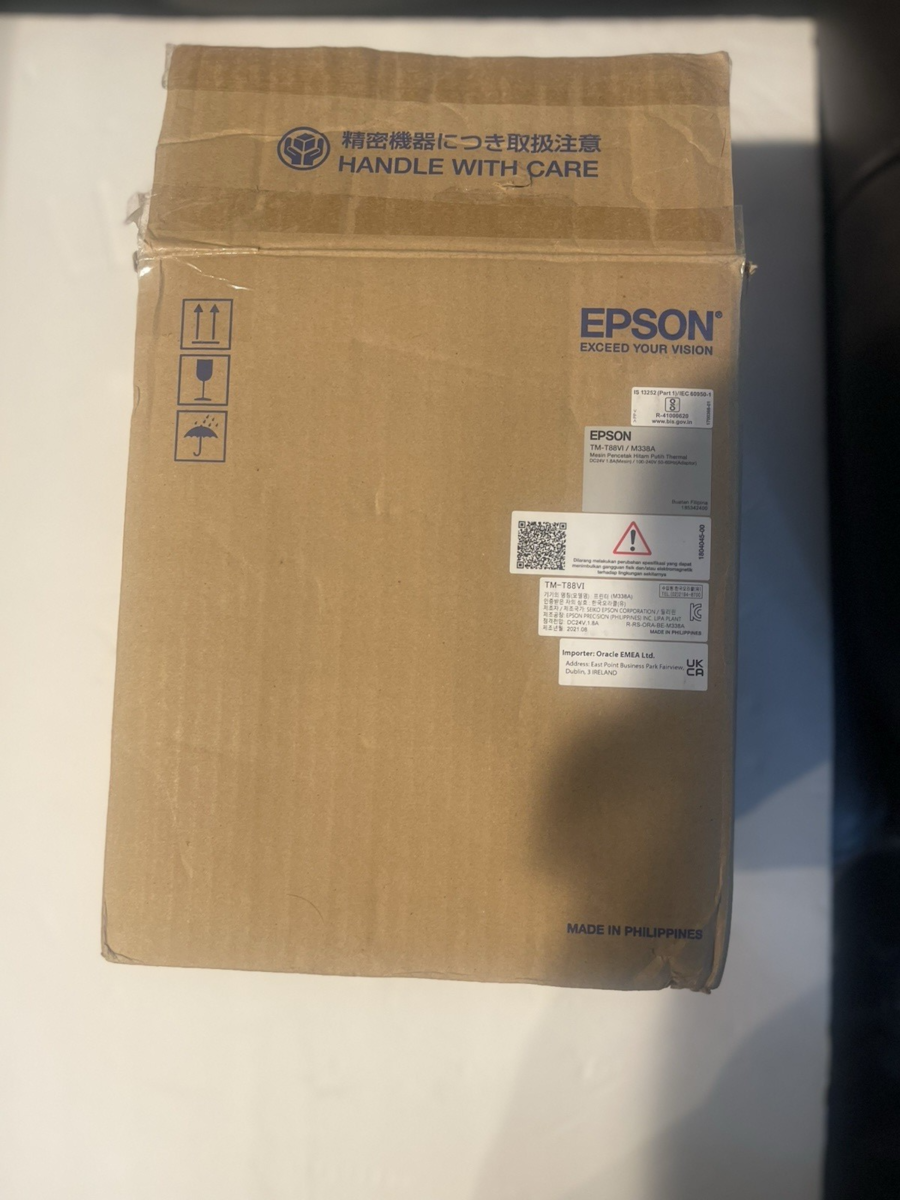 The Epson Micros Oracle TM-T88VI (Model M338A) is a high-performance, multi-interface thermal receipt printer for POS systems, known for its speed (up to 350mm/s), reliability, advanced cloud/mobile connectivity (Ethernet,Serial (RS-232) USB,, and paper-saving features, ideal for both traditional and web/tablet-based setups. The "Micros Oracle" branding indicates compatibility with Oracle MICROS systems, often used in hospitality, and the M338A model usually includes a power supply and essential interfaces for quick setup
