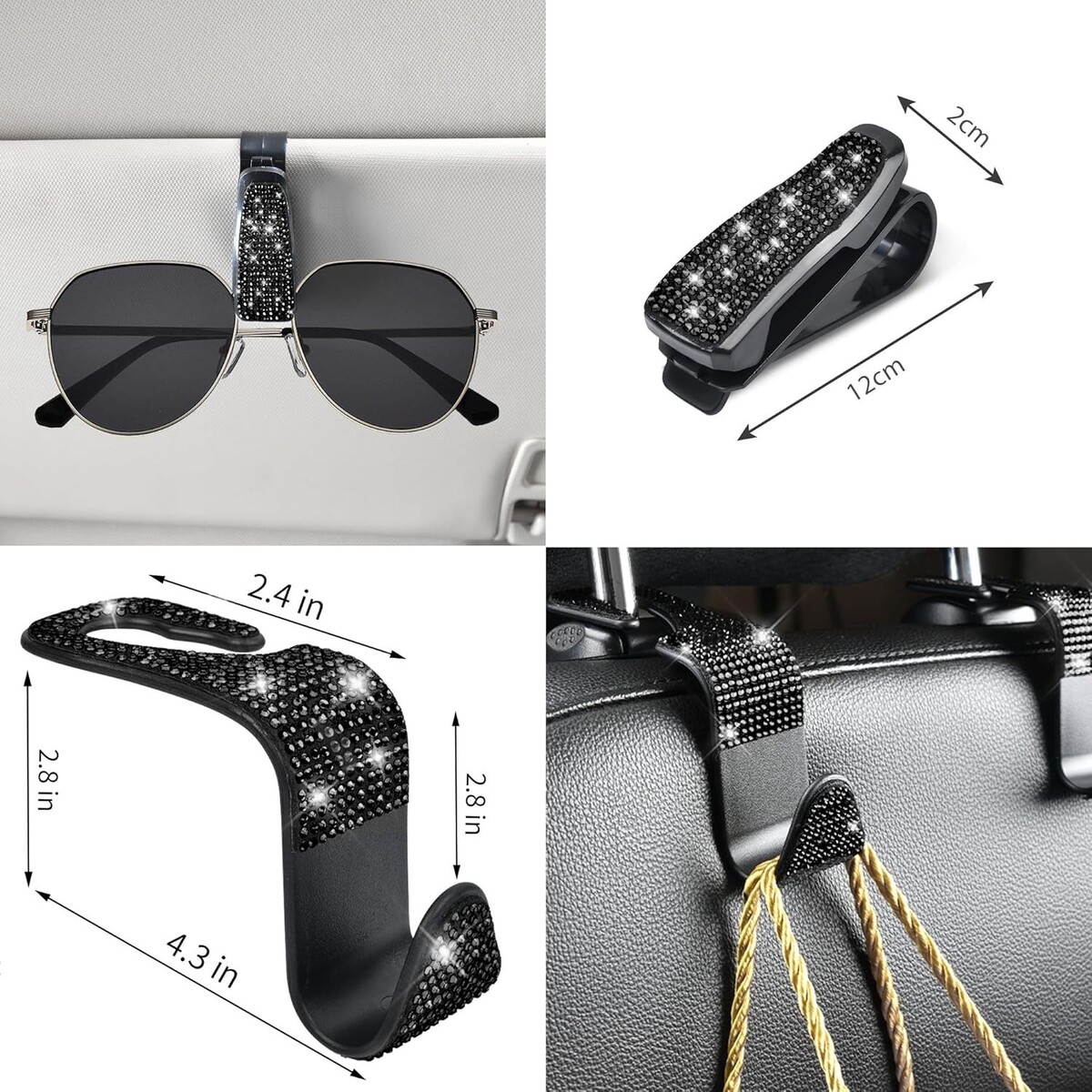 Items Included: Headrest Cover,Diamond Steering Wheel Cover,Diamond Gear Cover,Diamond Seat Belt Covers,Bling One Button Start Rings,Diamond Cup Holder Coasters,Hooks,Glasses Clip
