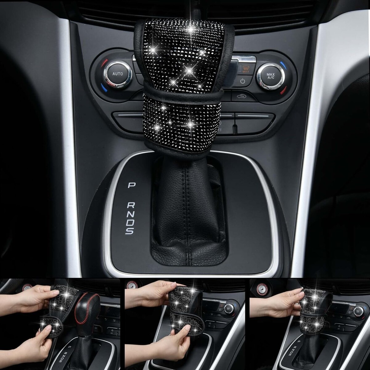 Complete Package: Includes 1 Diamond Steering Wheel Cover, 1 Diamond Gear Cover, 2 Diamond Seat Belt Covers, 2 Bling One Button Start Rings, 2 Diamond Cup Holder Coasters, 2 Hooks, and 1 Glasses Clip.