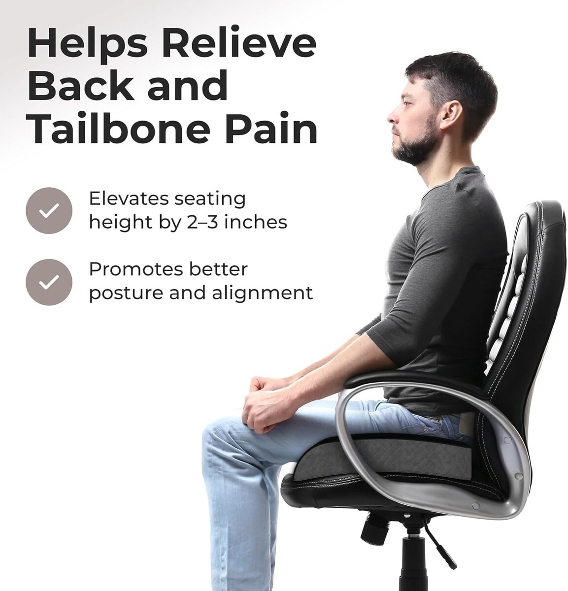 Lifts seating height by 2-3 inches, enhancing comfort in cars, offices, and favorite chairs.