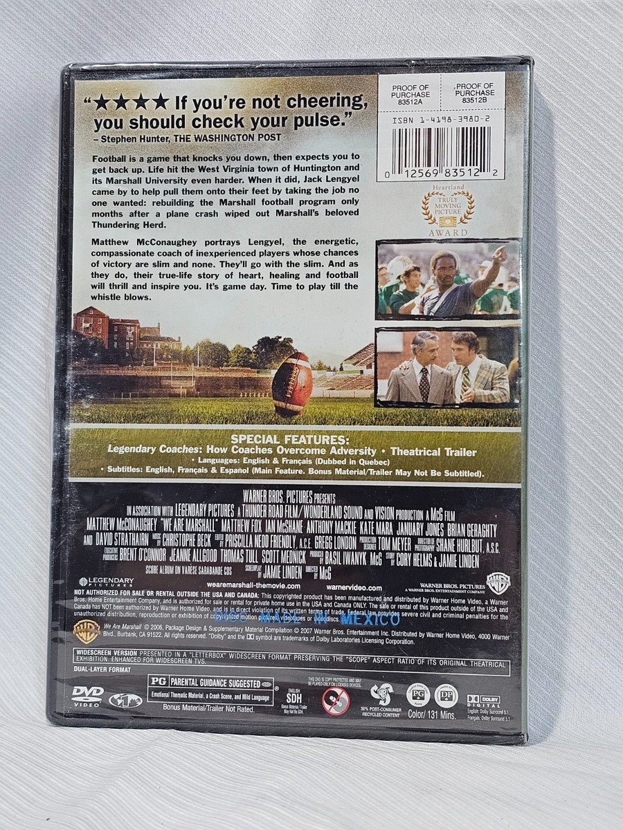 Description of item: We Are Marshall is an inspiring sports drama based on the true story of Marshall University?s football program and the tragedy that struck the team in 1970. After a devastating plane crash claimed the lives of most of the Marshall Thundering Herd football team, coaches, and supporters, the small town of Huntington, West Virginia, is left grieving and unsure if the football program should continue. Determined to rebuild the team and restore hope to the community, a new coach steps in to take on the challenge.