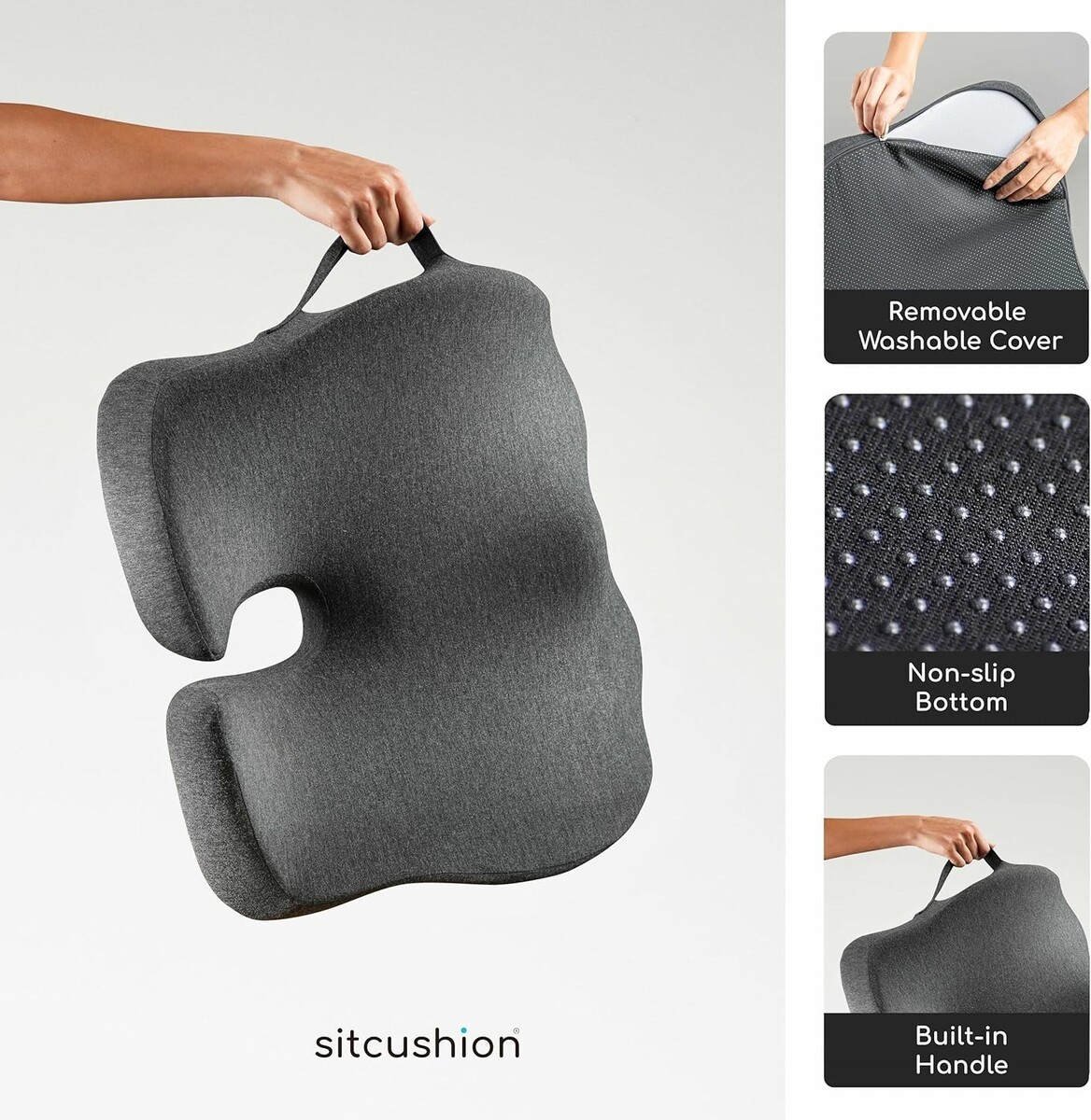 Features: Orthopedic,Ergonomic Design,Non-Slip Bottom,Removable Zippered Cover,Machine Washable,Breathable Cover,Carrying Handle,Medium Firm,Portable,Dual-Layer Memory Foam,Coccyx Cutout,Pressure Relief,Posture Correcting,Odor-Free