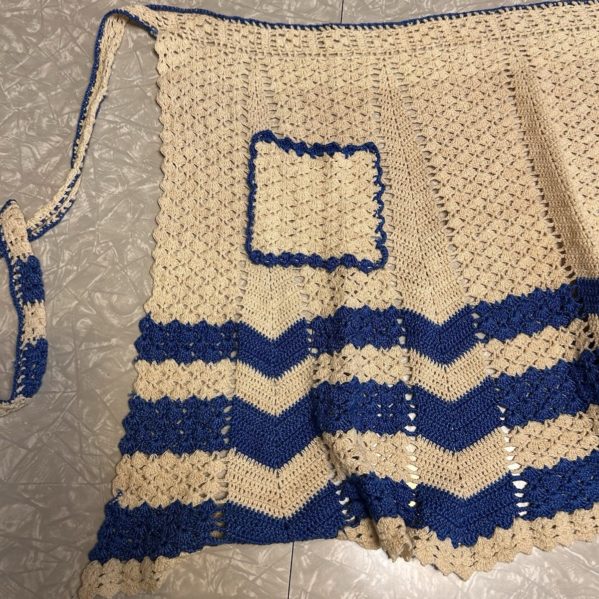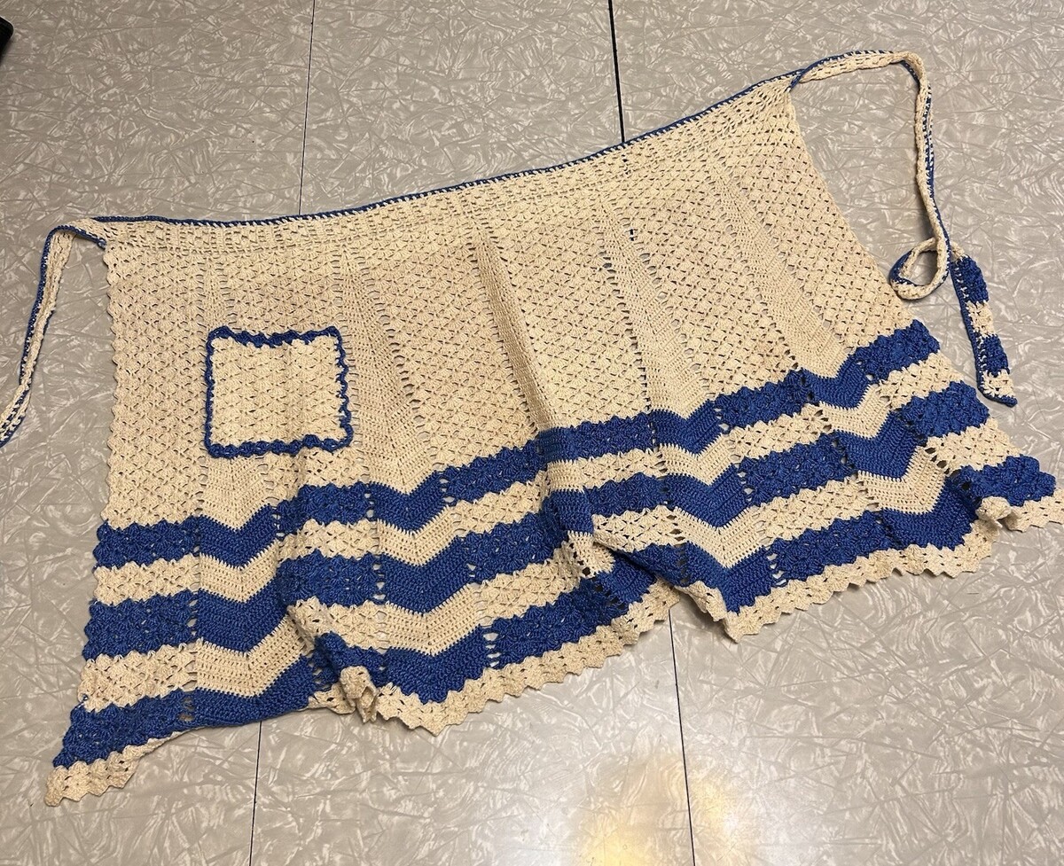 Vintage handmade crochet waist apron blue cream pocket