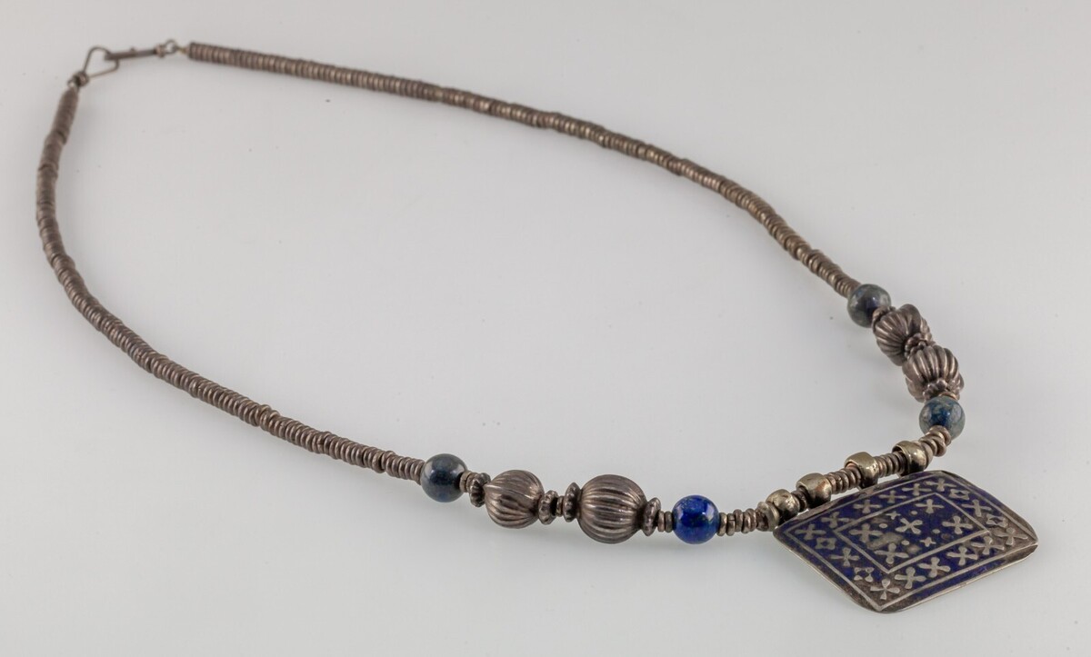 Antike Silberperlen Halskette Mit Lapis Akzenten Und Emaille Anhänger