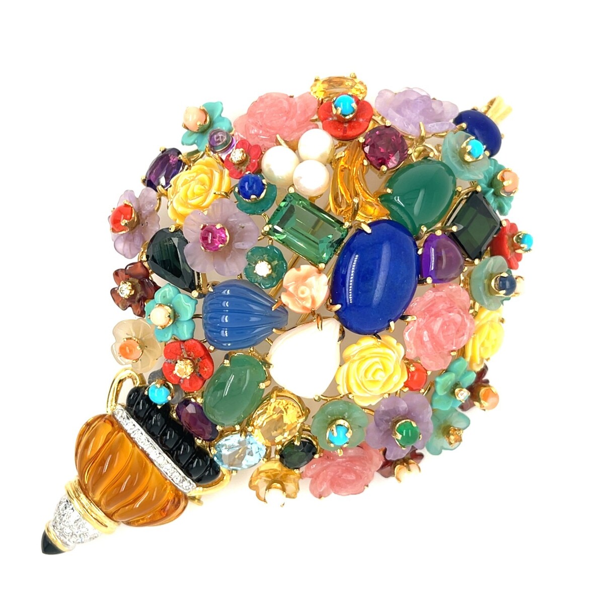 18k Gold Aufwendig Geschnitzter Multi-Strass Blumengesteck Brosche