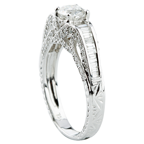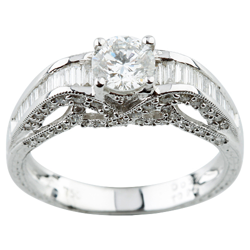 Verlobungsring aus 18 Karat rundem Diamant, Große 6, mit runden und Baguette-Akzenten