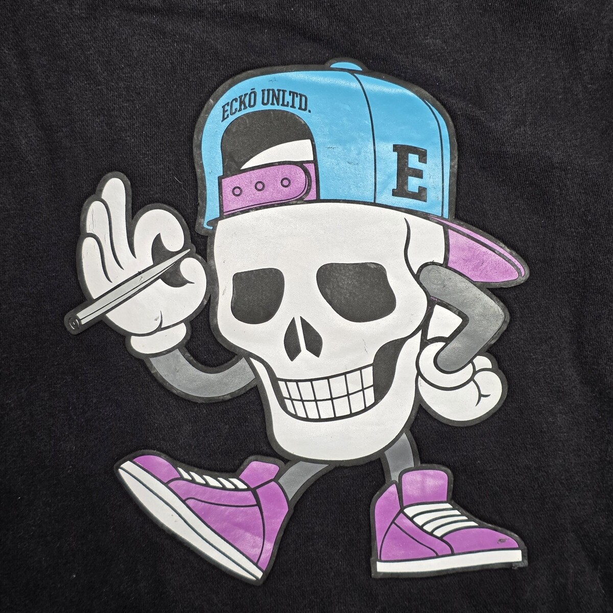 Front Design: Large Smoking skull character graphic wearing a blue/purple cap with an "E" and "ECKO UNLTD." text, purple sneakers, holding a pen/pencil