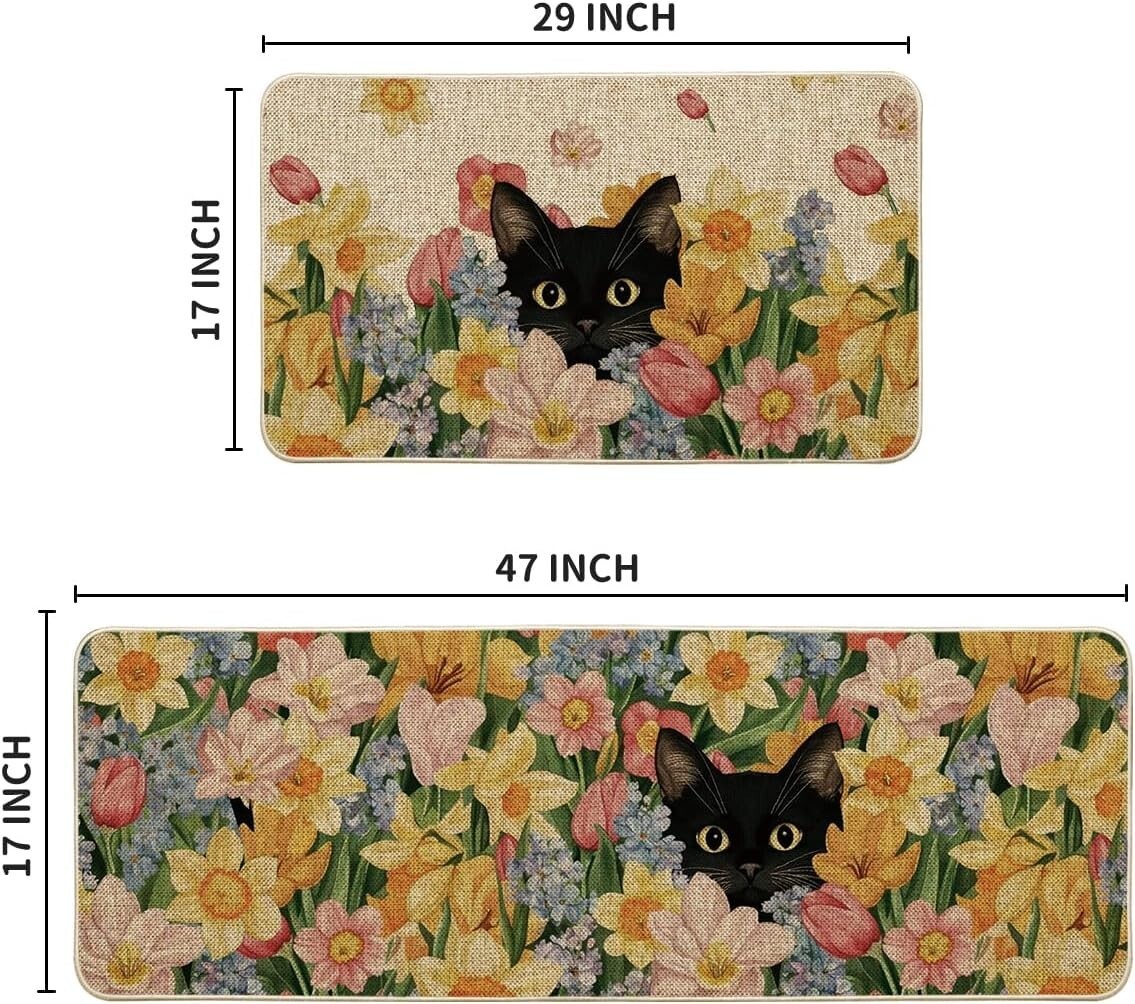 Non-Slip Black Cat Floral Kitchen Rugs - 17x29 & 17x47 Inch Set, Stain Resistant