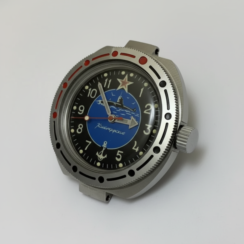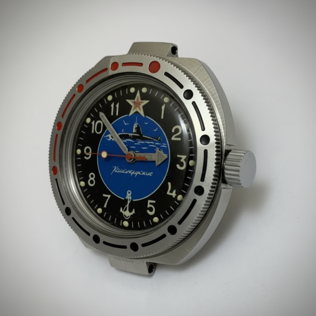 Distinctive **Submarine Commander dial** with a detailed submarine, anchor, and **red star**.