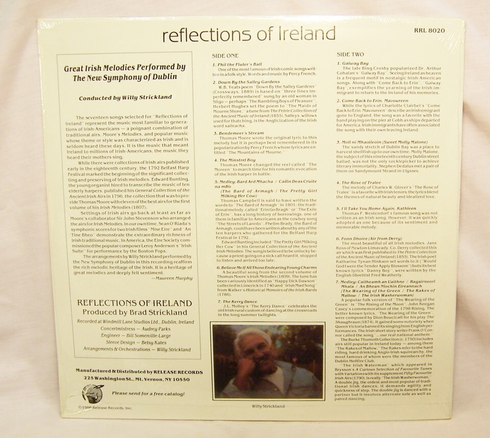 REFLECTIONS OF IRELAND Release Records, RRL 8020 1986 Arrangements Orchestrations by Willy Strickland Great Irish Melodies Performed by The New Symphony of Dublin MINT LP/MINT FACTORY SEALED SLEEVE UNOPENED! PLEASE VIEW OUR STORE FOR ADDITIONAL OFFERINGS OF UNUSUAL AND RARE CAST AND FILM SOUNDTRACKS! THANKS! Created bySeller's Assistant Basic.