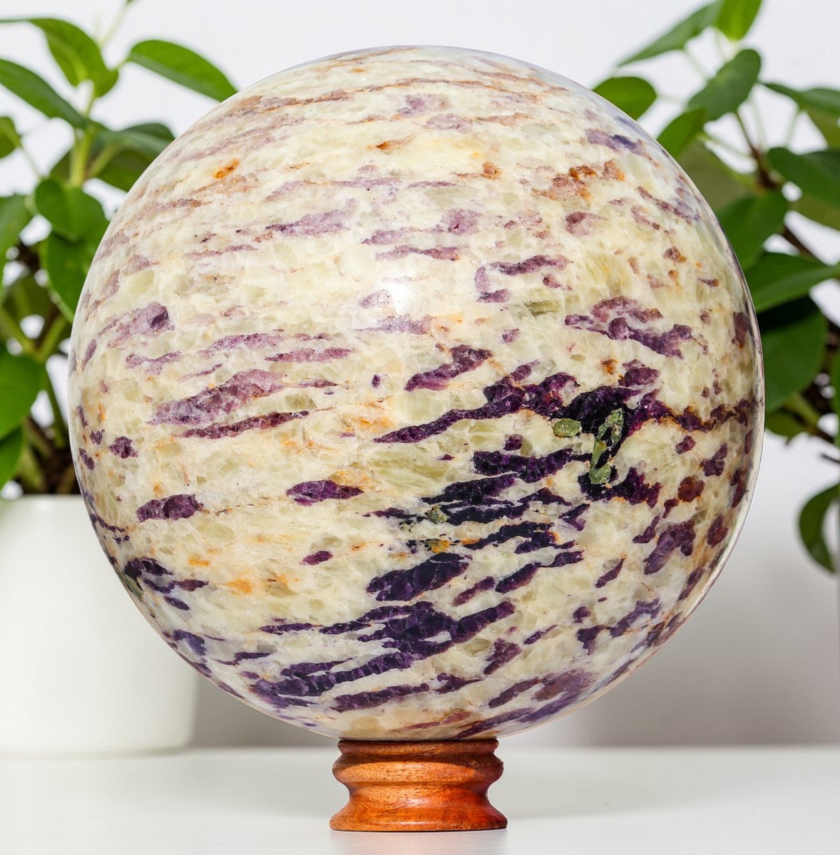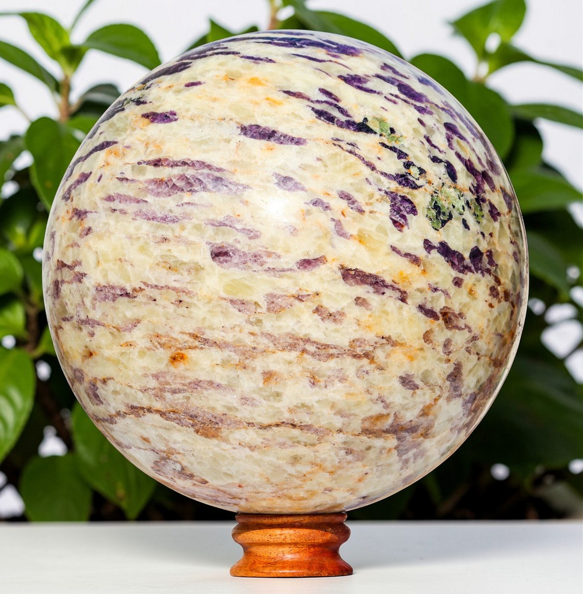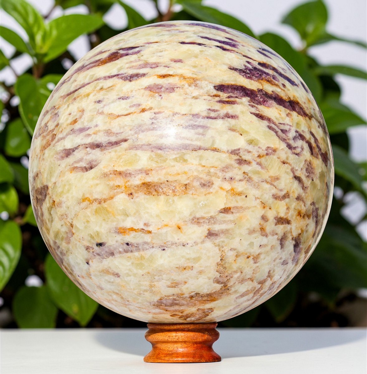 This remarkable sphere is a must-have for any crystal collector or enthusiast. Measuring an impressive 290mm in diameter and weighing 30650g, this polished piece features beautiful purple fluorite stones set in yellow calcite. The sphere is a natural formation from India, and its unique characteristics make it a valuable addition to any collection.