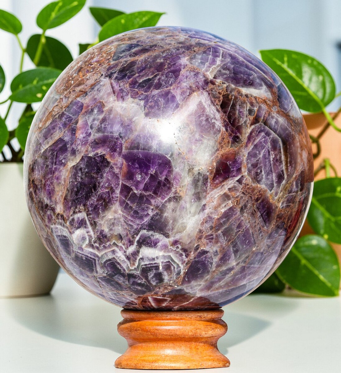 A purple amethyst crystal stone carved into a sphere is valued for its ability to radiate calming and protective energy equally in all directions, making it an excellent tool for promoting peace, balance, and spiritual growth.