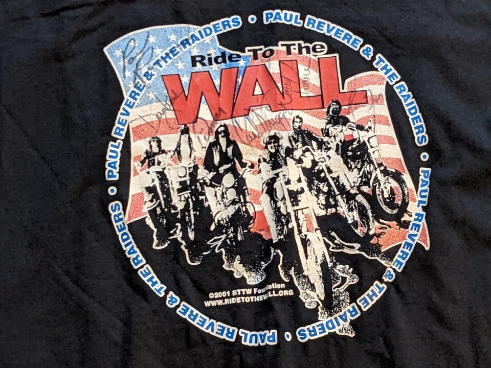 Up for sale is a used 2001 Paul Revere And Raiders Ride to The Wall Black Graphic T Shirt XL Signed.