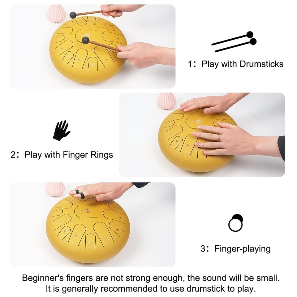 ??Rain Drum Package Included?12 inches steel tongue drum * 1, drumstick * 2, drumstick bag * 1, 2 set of notes sticker, drumstick bracket * 1,music book*1,finger sleeves*4,soft bag with strap * 1