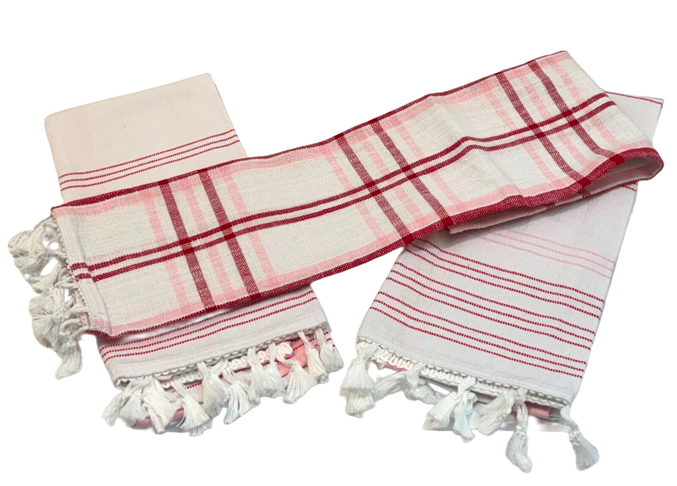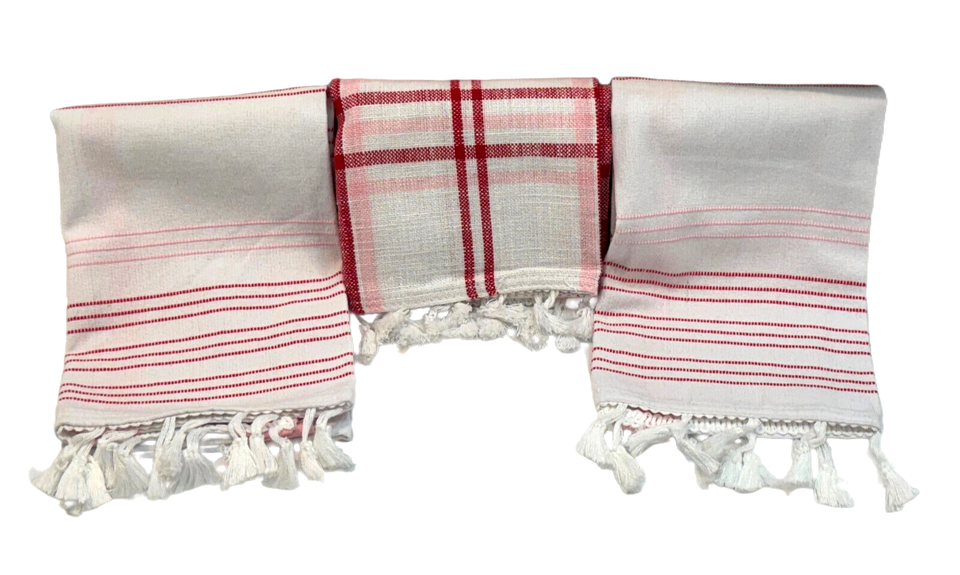 Always First Country 3 Piece Tea Towel Set Red Pink Tassels 100% Cotton