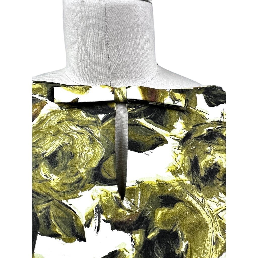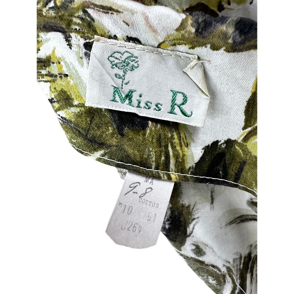 Miss R VTG 1950s Cotton Dress Cream Green Floral Full Skirt Belt Rockabilly S