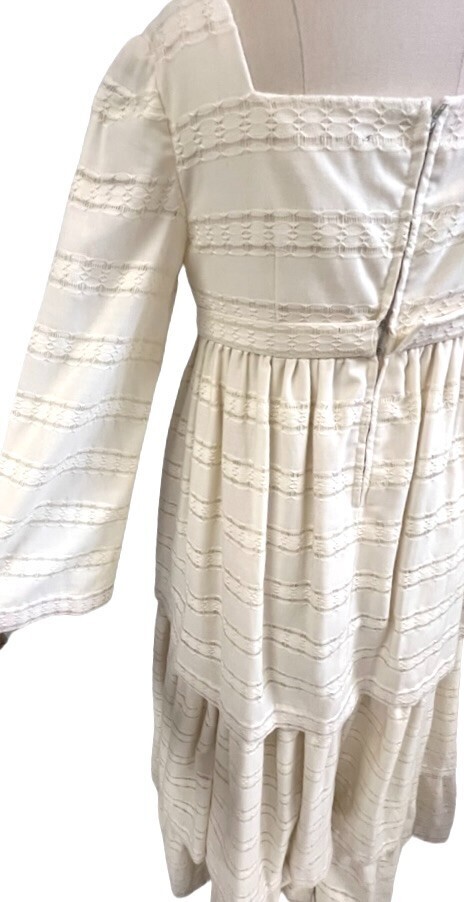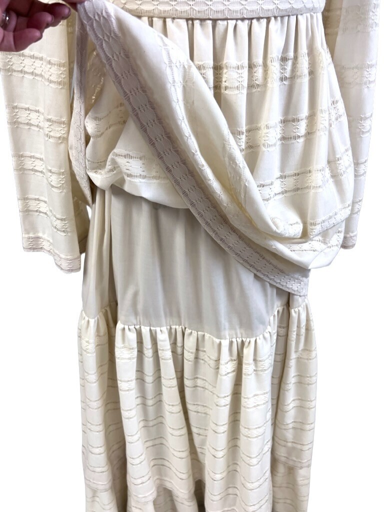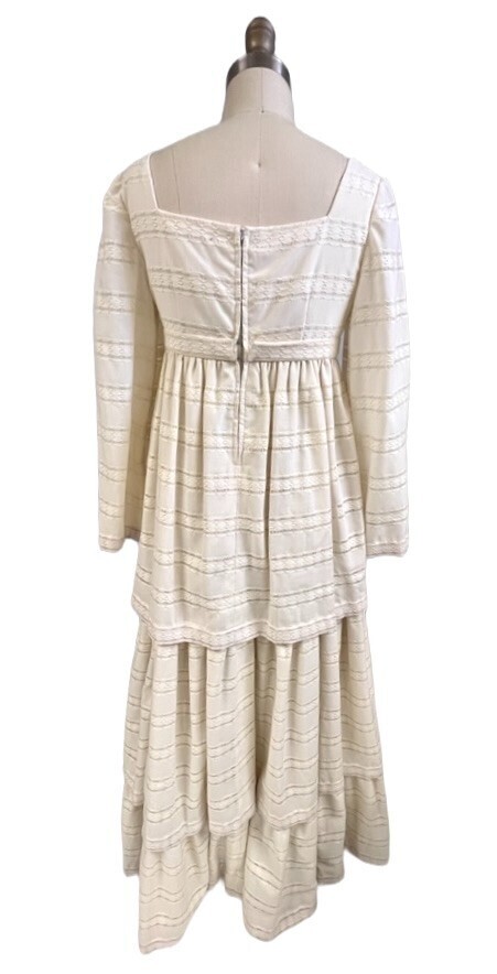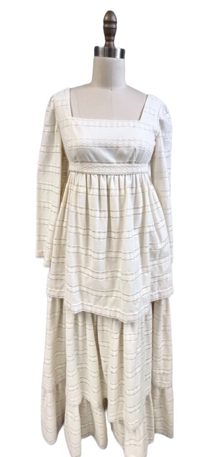 VTG 1970s Ivory Cotton Wedding Gown Tiered Maxi Empire Waist Crochet Trim S/M