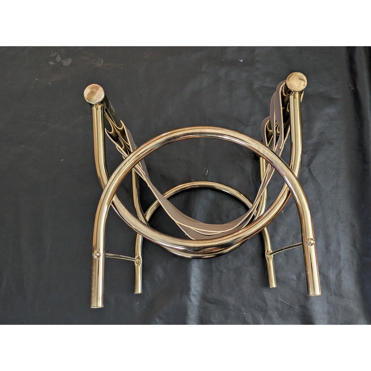 Vintage folding luggage rack adds a touch of mid-century modern elegance to any guest room or entryway. Constructed with a sturdy polished brass-tone metal frame, it features three durable leather straps designed to support heavy suitcases or books. The unique circular side supports provide a sophisticated architectural silhouette while allowing the piece to fold flat for easy storage when not in use. Perfect for boutique hotels, guest suites, or as a stylish home organization solution.