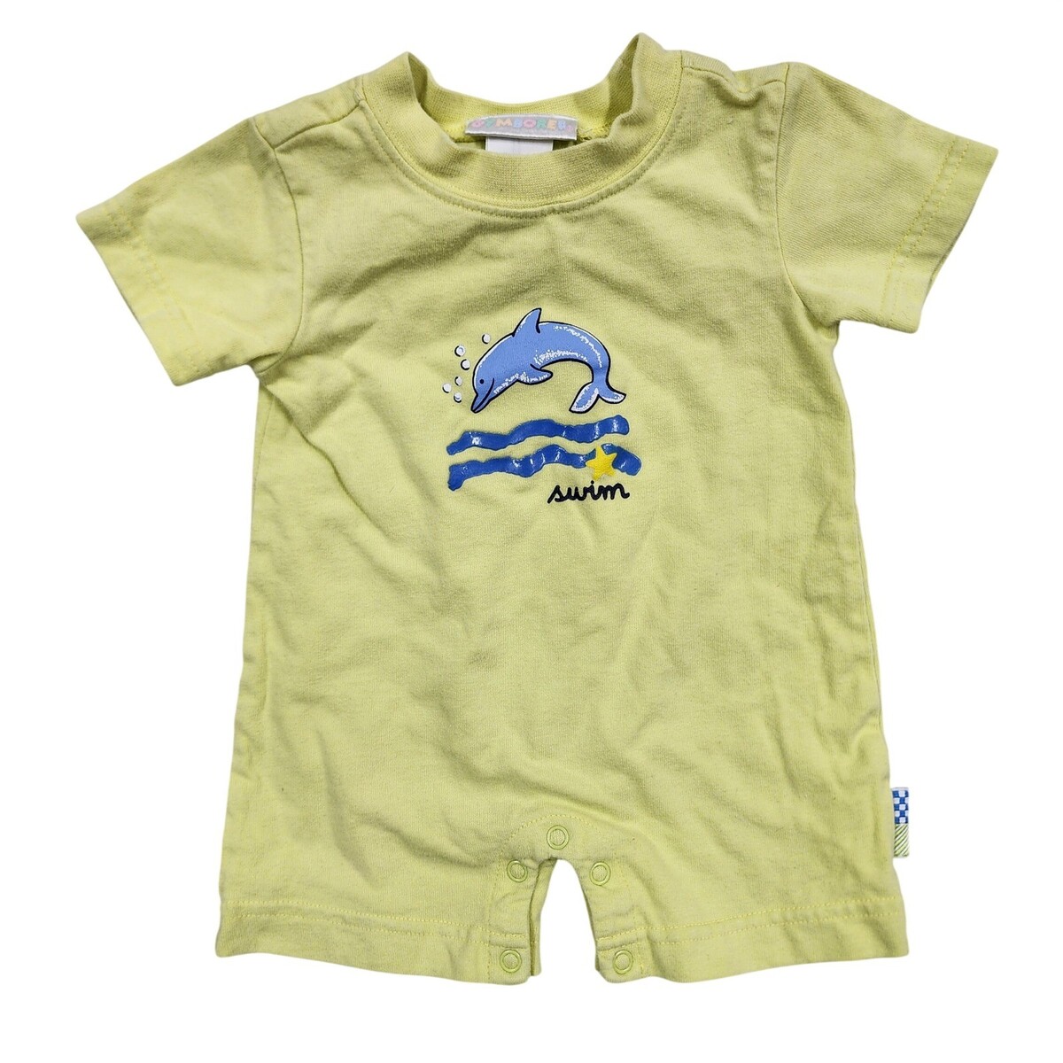 Keywords: Vintage Baby, 90s Gymboree, Dolphin, Ocean Theme, Summer, Retro Kids, Unisex, Pastel, Soft Cotton, Beachy, Nostalgic, Animal Graphic, Baby Romper, eco-friendly, comfy, T shirt romper, cruise/resort/vacation, natural fabric, pastel rainbow tag