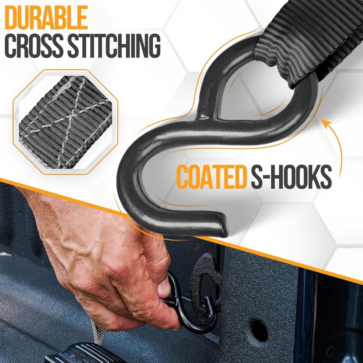 Set Includes: 4 metal ratchet buckles with rubber grips, 4 soft loops, 4 heavy-duty S-Hook Straps