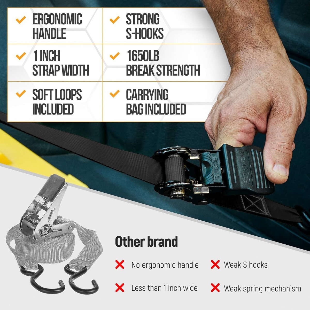 Ratchet Tie Down Strap Set 1650lb - 4 Pack 15ft x 1in with Soft Loops