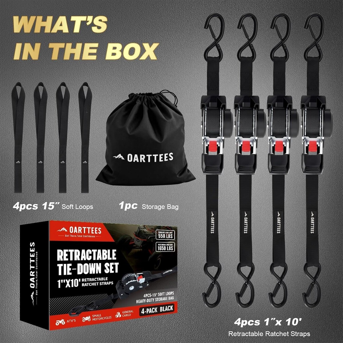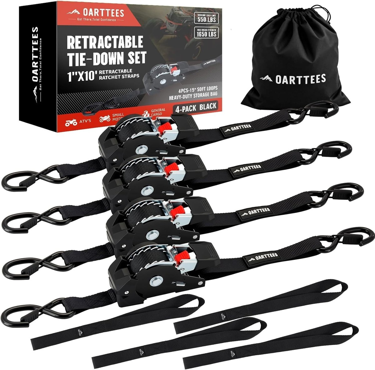 Ideal Length Heavy-Duty Strength: 1 inch width and 10 feet length retractable tie-downs rated at a 550 lbs safe working load and a maximum break strength of 1650 lbs.