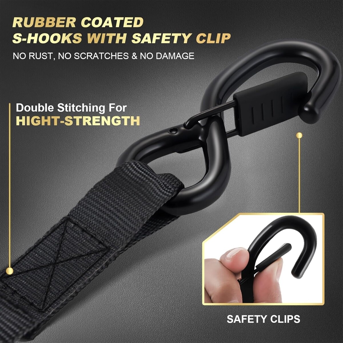 Steel Core Coated S-Hook with Safety Clip: Rubberized S Hooks with built-in retention clips prevent accidental unhooking, ensuring a reliable connection even during movement or vibration.