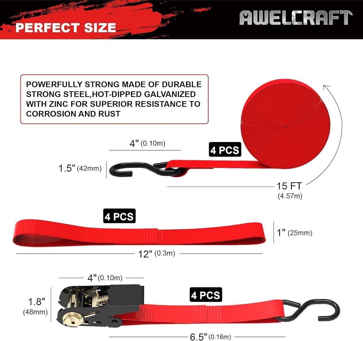 1500 lbs Breaking Strength Tie Downs - 4x 15ft Ratchet Straps with Soft Loops