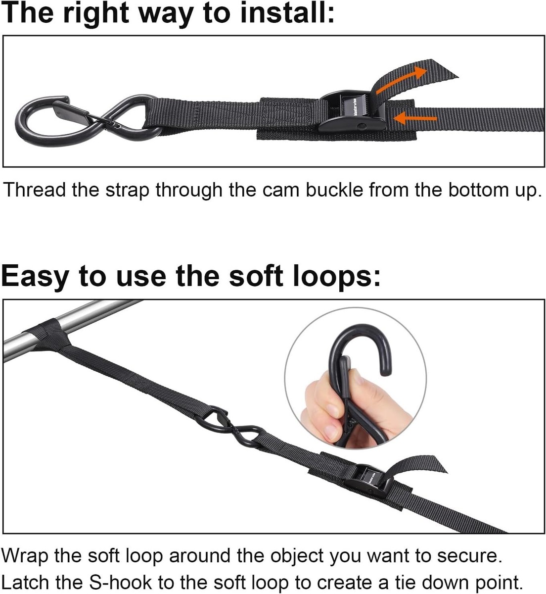 Size Measurement: Each strap measures 1?x8?, with a load capacity of 400lbs and a breaking strength of 1200lbs. The set includes 4 motorcycle straps and an extra 4 soft loop straps.