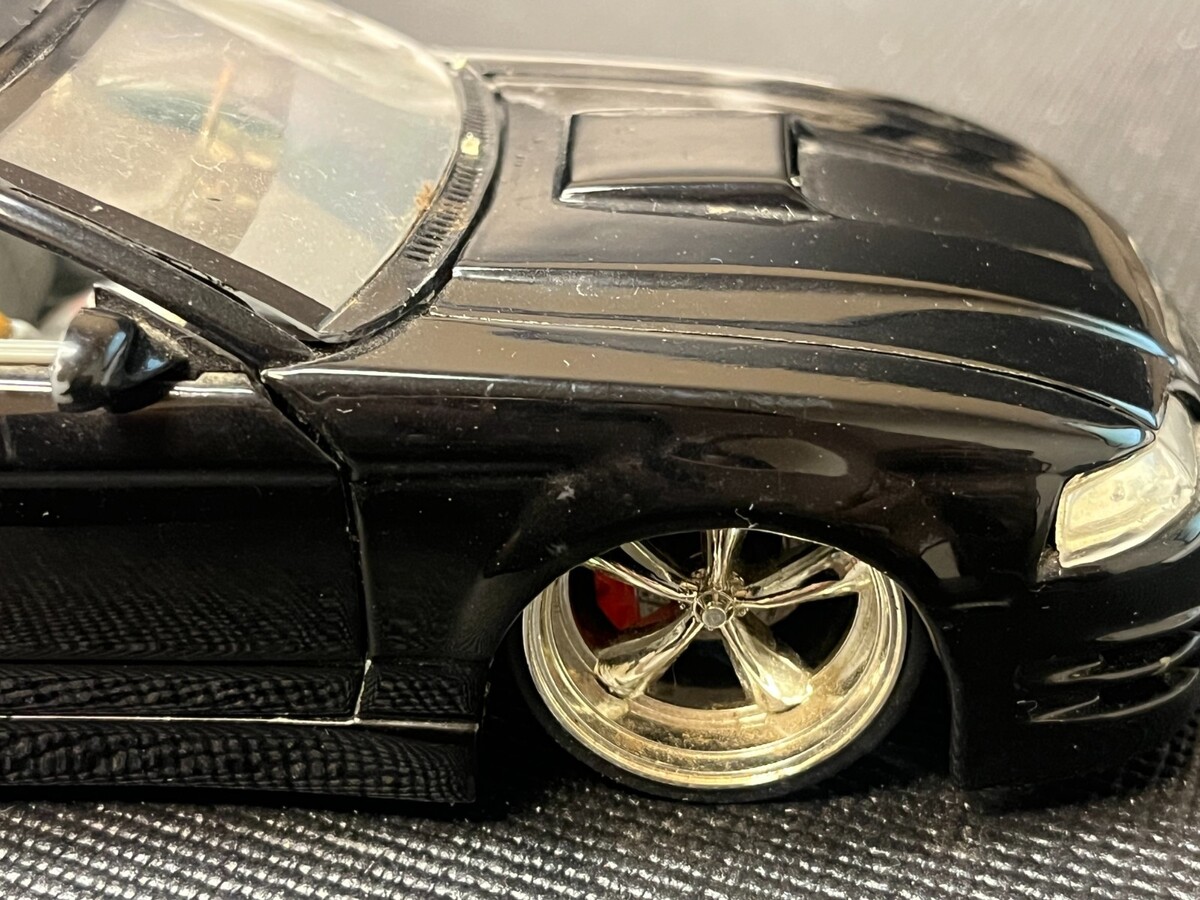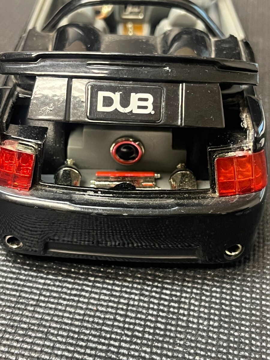 Pre-owned Jada Toys Dub City 2003 Ford Mustang Convertible 1:24 die-cast model in black with signature tuner styling, custom rims, and opening doors/hood/trunk. Displays well despite missing driver side mirror and windshield wipers, plus minor marks/scratches from play/display?typical for loose lowrider models. Still a solid collectible for Mustang, Jada Dub City, or custom car enthusiasts. See all photos for exact condition before buying.