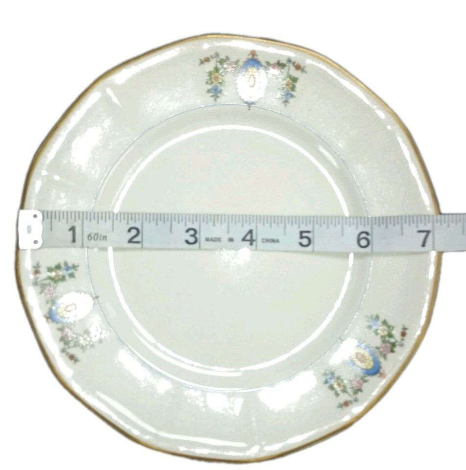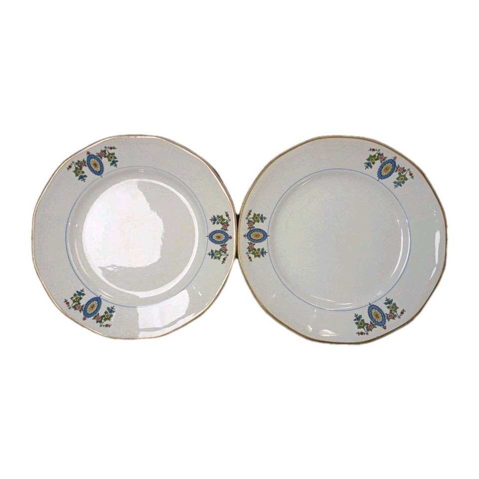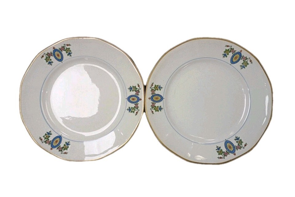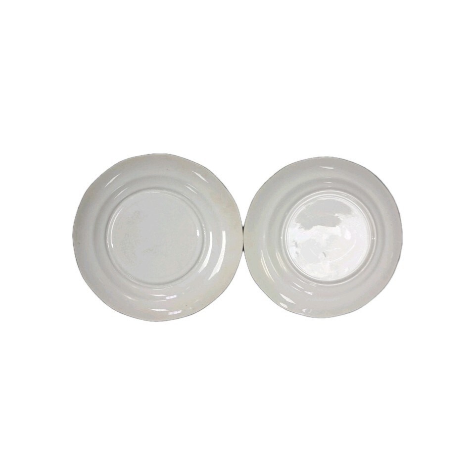 This product is a set of two antique salad plates from Globe China Company, featuring intricate 18K gold trimming and a round shape. Manufactured before 1925, these bone china plates have a diameter of 7 inches, making them perfect for all occasions. The elegant gold color adds a touch of luxury to any dining table, especially for those who appreciate the craftsmanship of the early 20th century. Please indicate age visible in crazing.Ideal for collectors or those looking to add a vintage touch to their home decor.