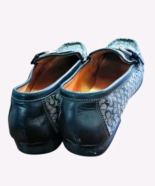 The Coach Emery Black Canvas and Leather Loafers with a Silver Buckle in size 8.5 are a stylish and versatile footwear option for women. Featuring the signature Coach logo, square toe shape, slip-on closure, and adjustable strap, these loafers are perfect for various occasions including travel, casual outings, workwear, and business meetings. The combination of black canvas and leather materials with silver accents adds a touch of luxury to any outfit. Made in Italy, these flats are designed for comfort and durability, making them a fashionable and practical choice for any season.