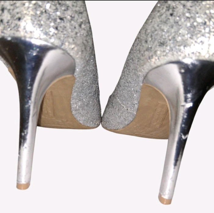 The Christian Siriano Women's Silver Glitter High Heel Party Pumps in size 7.5 are the perfect choice for any special occasion. Featuring a slip-on closure and stiletto heel, these pumps are designed to make a statement. Made with synthetic material and accented with glitter, they exude glamour and style. The elegant silver color and pump style make them versatile for parties, cocktails, or any event during the summer, fall, spring or Holiday Seasons. With a touch of luxury from the Christian Siriano brand, these heels are sure to add a touch of sparkle to any outfit. Heels have some scuffs; flaws are visible and are be noted in photos.