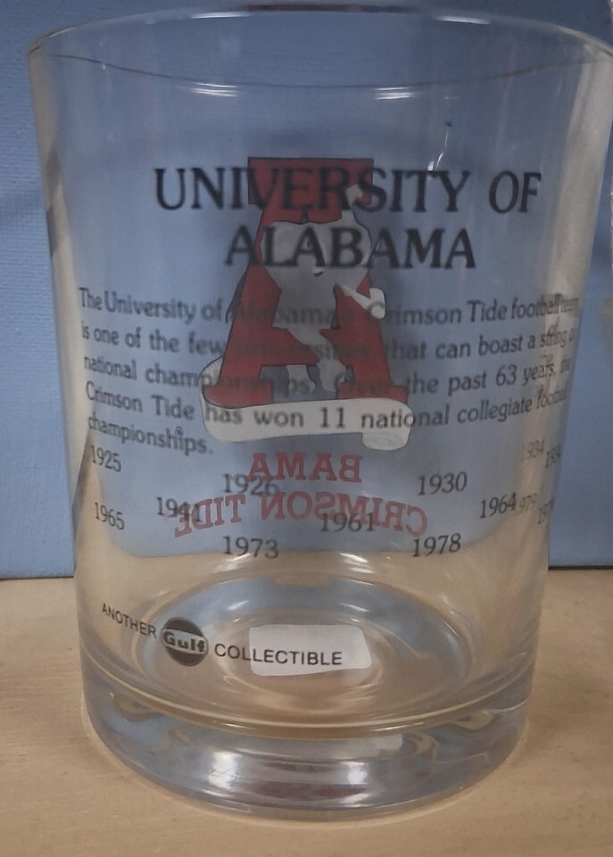 The University of Alabama Bama Crimson Tide Glass Tumbler is a collectible item featuring the iconic championship years. These clear tumblers are perfect for fans of the Alabama Crimson Tide football team, especially during the regular season. Made for unisex adults, this product is a stylish way to show support for your favorite college team while enjoying a beverage. The glass design adds a touch of sophistication to any fan's collection, making it a must-have for supporters of the Crimson Tide.