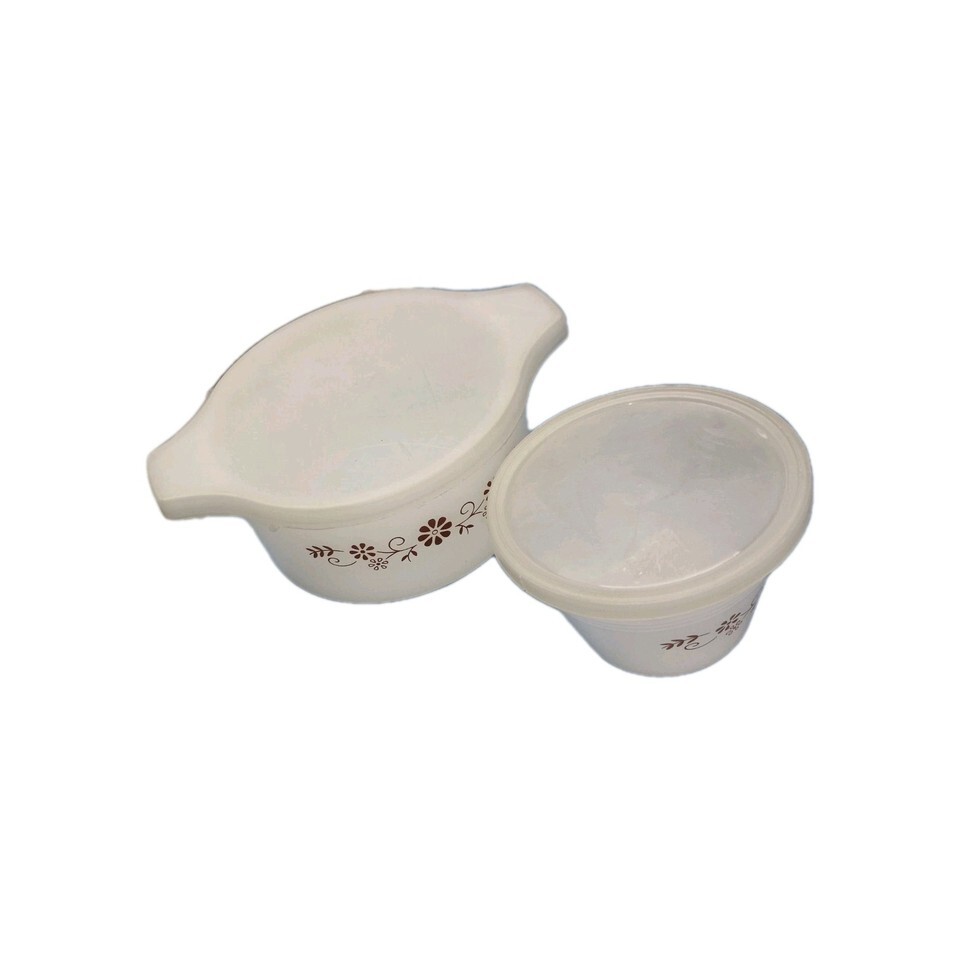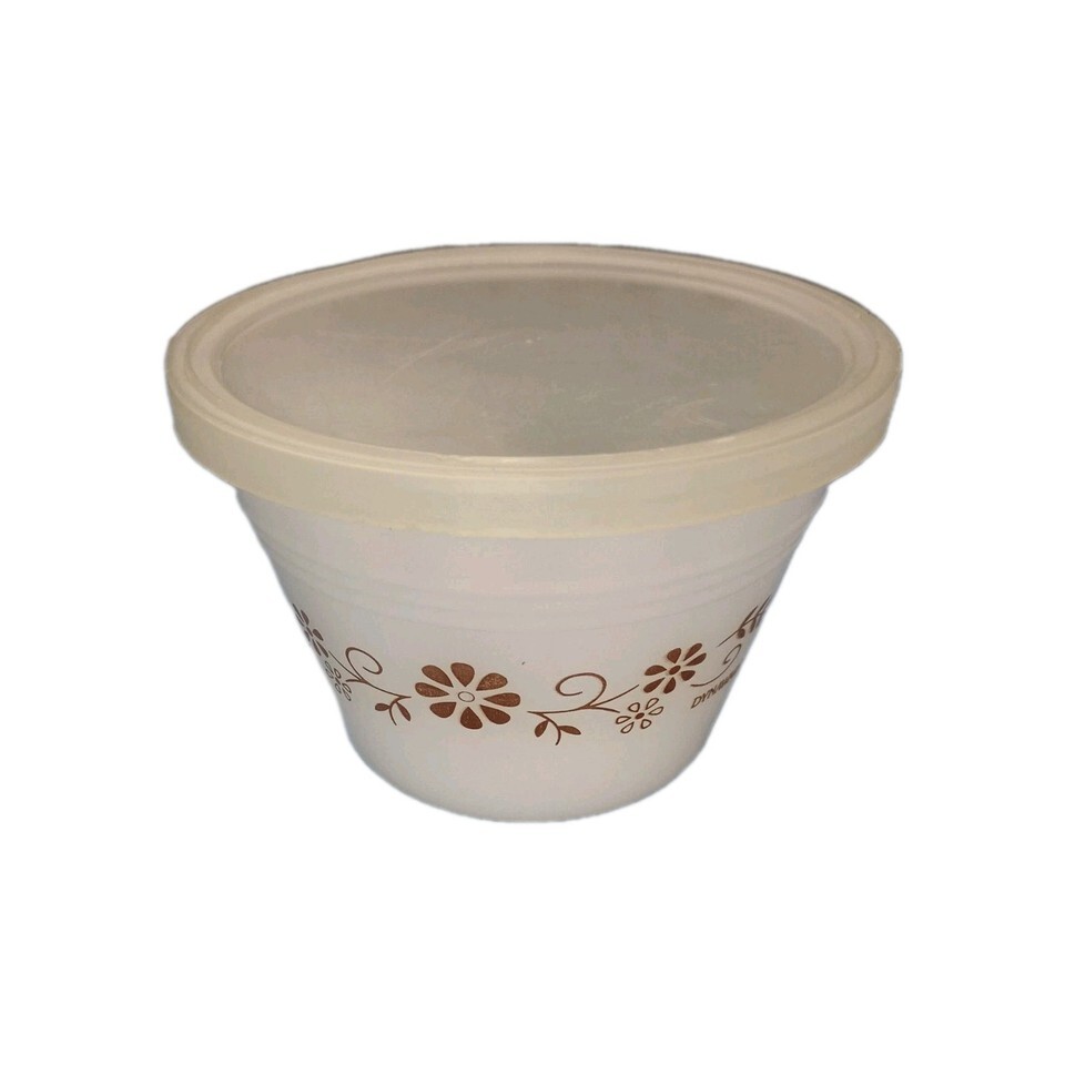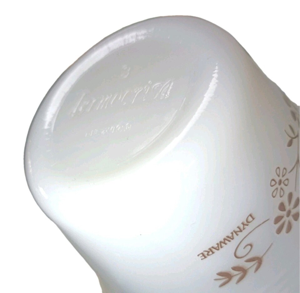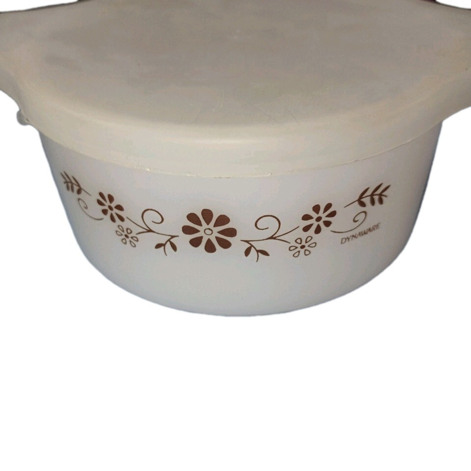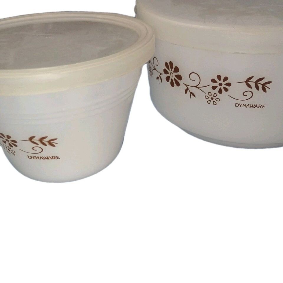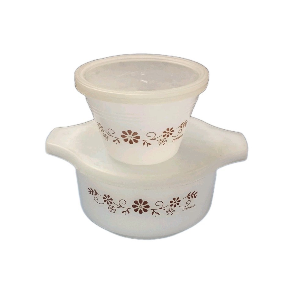 This four-piece set includes a vintage Dynaware Termocrisa brown daisy pattern custard cup and small casserole, perfect for all occasions. Made of milk glass with a decorative round shape, this stackable bowl set features a retro design from the late 20th century. The Termocrisa brand and production style add to its charm, making it a unique addition to any kitchen or dining space. Easy to clean with a dishwasher-safe construction, this set is a delightful find for collectors of vintage cookware.